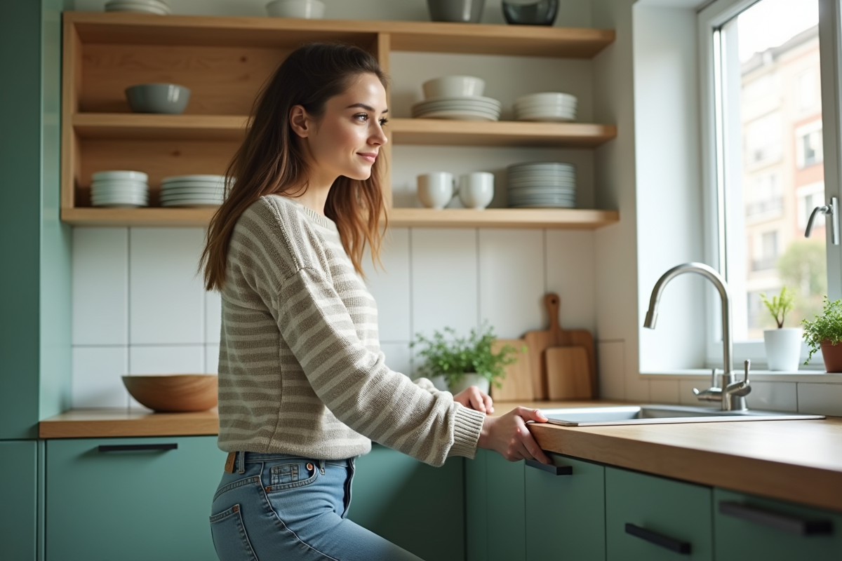Choisir la palette de couleurs ne suffit pas. Tout se joue aussi sur la façon d’articuler matériaux, volumes et lumière. Pour une impression de grandeur, soignez la continuité visuelle : les meubles clairs qui se fondent avec le sol ou les murs prolongent la perspective et agrandissent la cuisine. Dans une pièce ouverte, l’écho des couleurs avec le salon ou la salle à manger fluidifie le regard d’un bout à l’autre.